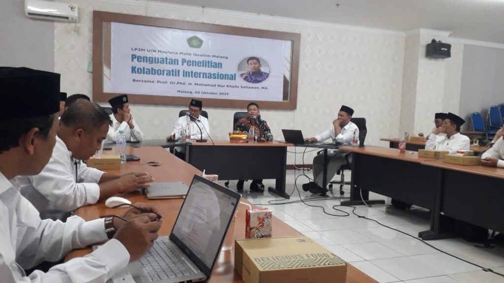 PAI FITK UIN Malang – Salah satu ukuran perguruan tinggi yang bereputasi adalah dapat dilihat melalui kegiatan riset-riset monumental. Untuk mencapai riset tersebut, LP2M menyelenggarakan workshop Penguatan Penelitian Kolaboratif Internasional yang melibatkan para guru besar, wakil dekan bidang akademik, dan semua kaprodi dilingkungan UIN Maliki Malang di ruang pertemuan Lt.