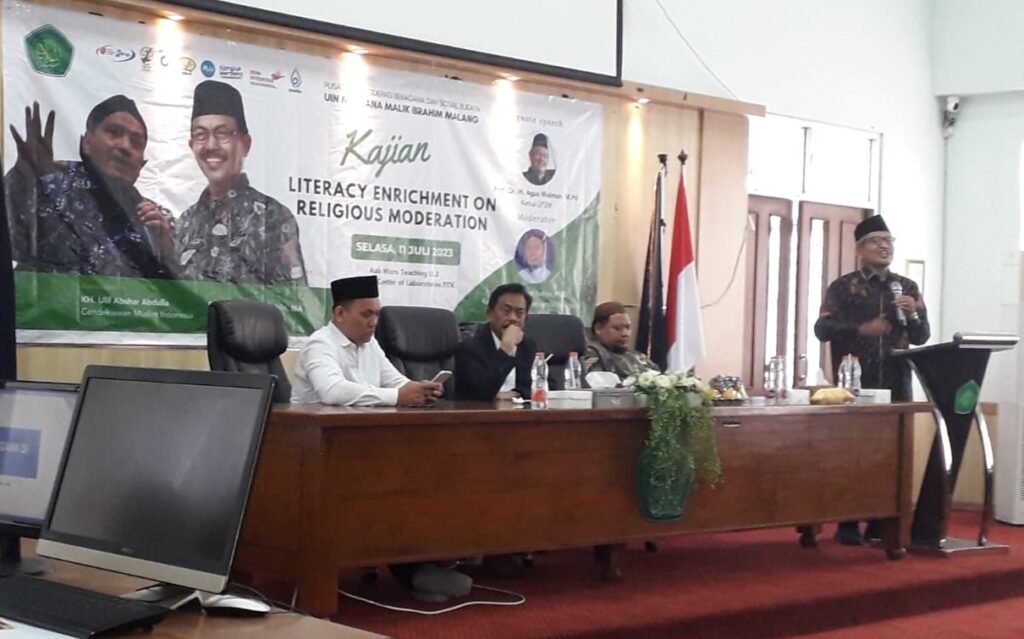 PAI FITK UIN Malang – Tema penting terkait dengan wacana moderasi agama selalu menarik perhatian banyak orang, termasuk di perguruan tinggi UIN Maulana Malik Ibrahim Malang yang dimotori oleh Kepala Pusat Studi Modersasi Agama dan Sosial Budaya. Hadir sebagai narasumber utama dalam kegiatan “kajian Literacy Enrichment on Religious Moderation” KH. Ulil Abshar Abdalla di Aula Lt.2 Gedung Microteaaching FITK, yang dihadiri lebih dari 150 peserta dari akademisi, mahasiswa dan peserta luar kampus, pada hari Selasa (11/07/2023).