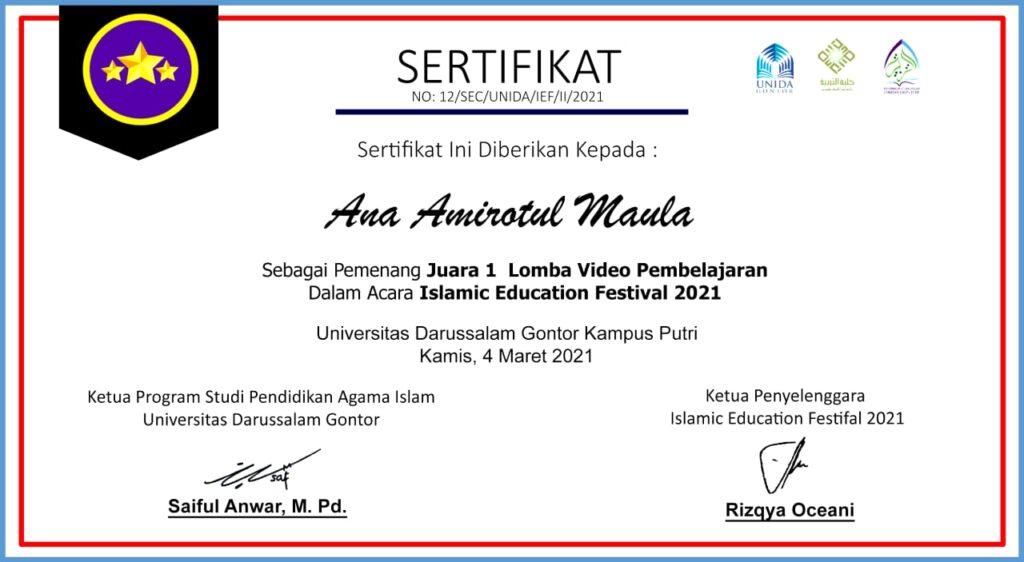 32 | Ana Amirotul Maula | Juara 1 Lomba Video Pembelajaran dalam Islamic Education Festival 2021 Univ Gontor | 2021 | |