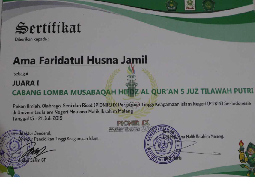 59 | Ama Faridatul Husna Jamil | Juara 1 Lomba Musabaqoh Hifdz Al Qur’an 5 juz PIONIR IX di UIN Malang | 2019 | |