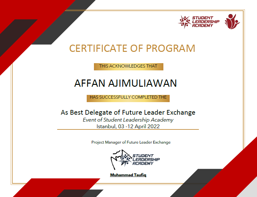 1 | Affan Ajimuliawan | Best Delegate of Future Leader Exchange Istanbul | 2022 | |