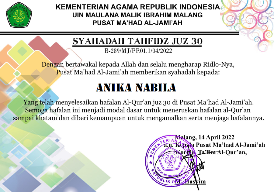 89 | Gadis Tria Sahputri | Peserta Wisuda Tahfidz Al-Qur’an HTQ Pusat Ma’had Al-Jami’ah UIN Malang Kategori 10 Juz | 2020 | |