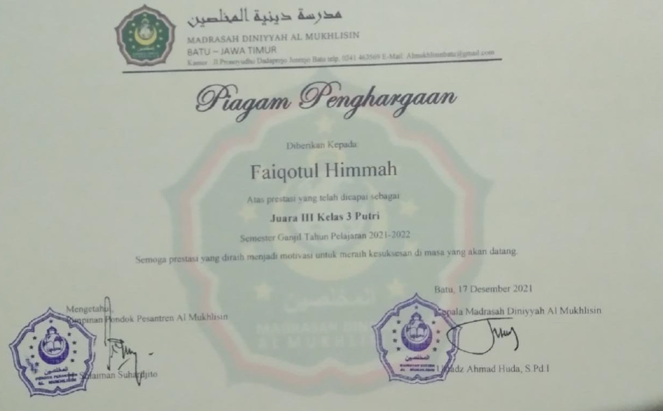 85 | Nailatul muna | Juara 2 Lomba Musabaqoh qiro’atil kutub se-kab lmg dlm rangka memperingati hari santri nasional yg di selenggarakan oleh Pem.Kab Lmg | 2021 | |